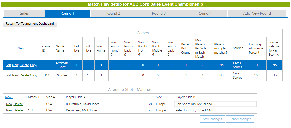 In the example below, There are two games setup for Round 1: Alternate Shot and Singles. Within each game there are matches which are displayed in a second grid below the games. The displayed matches correspond to the selected (hilighted) game row. To see the matches for other games, click the corresponding game row.