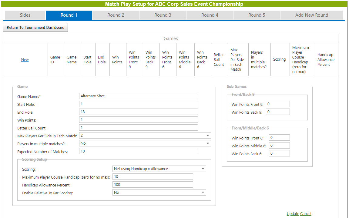 Sub-Games - If this is an 18 hole game, then you can optionally easily create Front 9/Back 9 and/or Front 6/Middle 6/Back 6 sub-games. A sub-game uses the same game match-ups and applies win points based on the defined section of the course. Sub-games will appear as individual leaderboards. The Win Points should be set accordingly. A win point value of zero indicates that there is no sub-game for this section of the course.